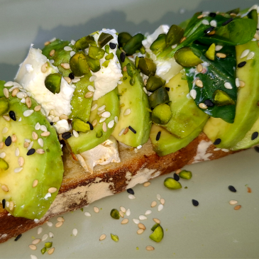 Bruschetta , chèvre,avocat pistaches concassées.