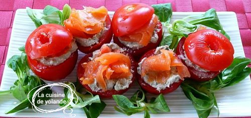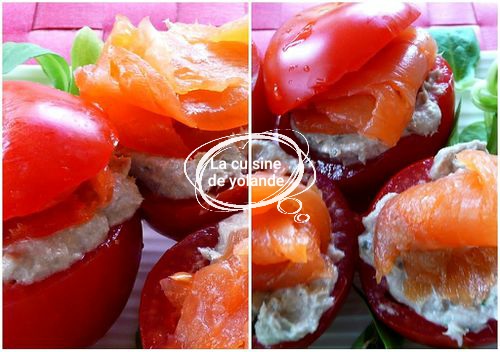 Au moment de servir, remplissez les tomates de rillettes et ajoutez une petite tranche de saumon.