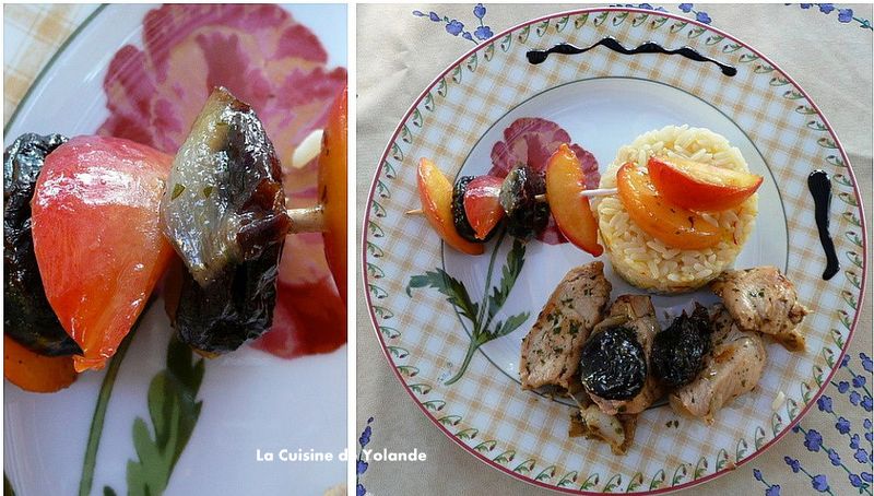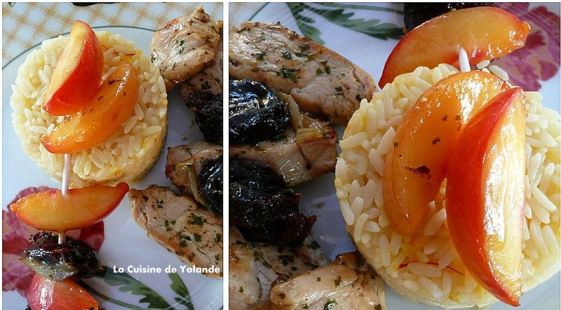 Dressez sur les assiettes de service les cubes de poulet, le riz safrané dans des cercles à mousse, piquez sur des piques à brochettes les fruits en alternant les nectarines et les pruneaux, nappez de la sauce réduite au vin blanc.