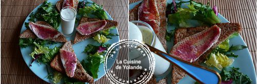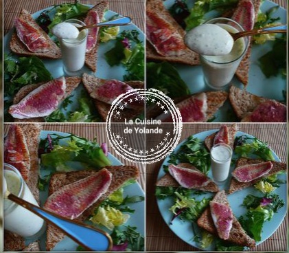 Faire griller les rougets à la plancha quelques minutes, passer les tranches de pain de mie au toaster et coupez les en deux dans la diagonale, dresser sur les assiettes, sur une salade mélangée et la sauce dans des petits verres à vodka.