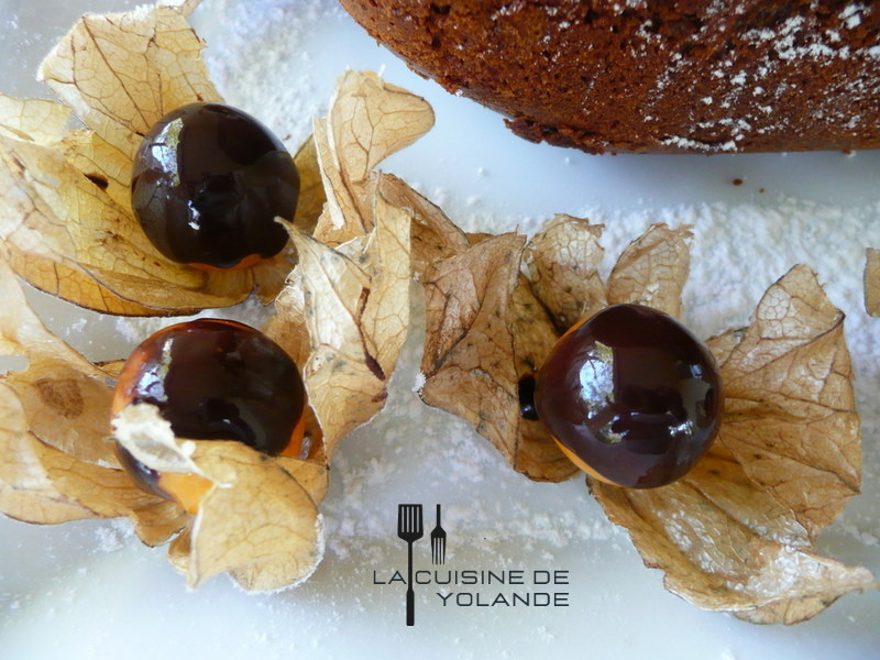 Procédez ensuite à la décoration, les psysalis sont trempés dans la sauce chocolat, saupoudrez le plat de sucre glace et au gré de votre fantaisie.