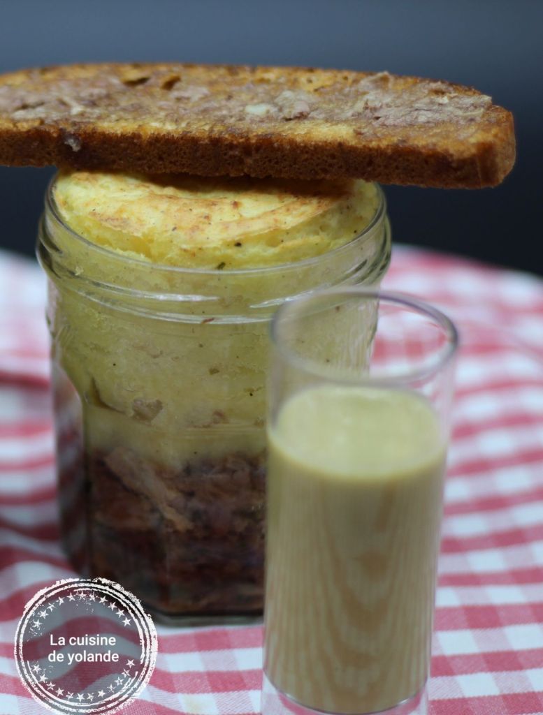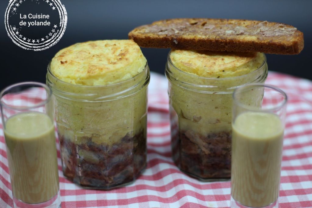Enfournez les pots de hachis parmentier  et faire cuire  30 min à 180°, le dessus de la purée doit être doré. Passez s’il le faut quelques minutes  au gril du four pour obtenir une jolie couleur dorée sur le dessus des pots.