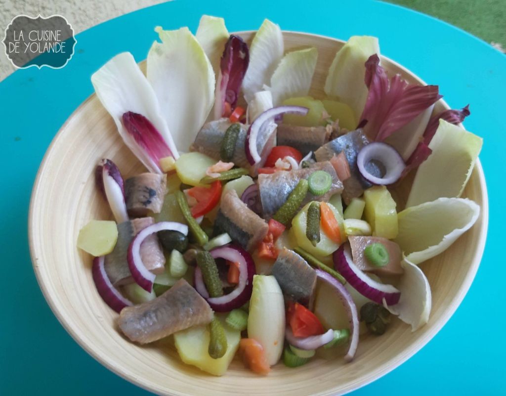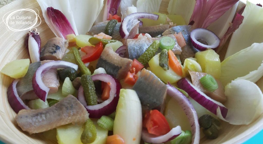 En cette saison entre printemps et bientôt l’été j’aime composer des salades avec ce qui me tombe sous la main, ce soir deux ingrédients m’ont donné le » La » ce sont les harengs et les pommes de terre , suivirent une cebette, quelques olives noires et quelques feuilles de carmine et endive et ma salade fût dégustée avec plaisir, la simplicité c’est essentiel pour moi.