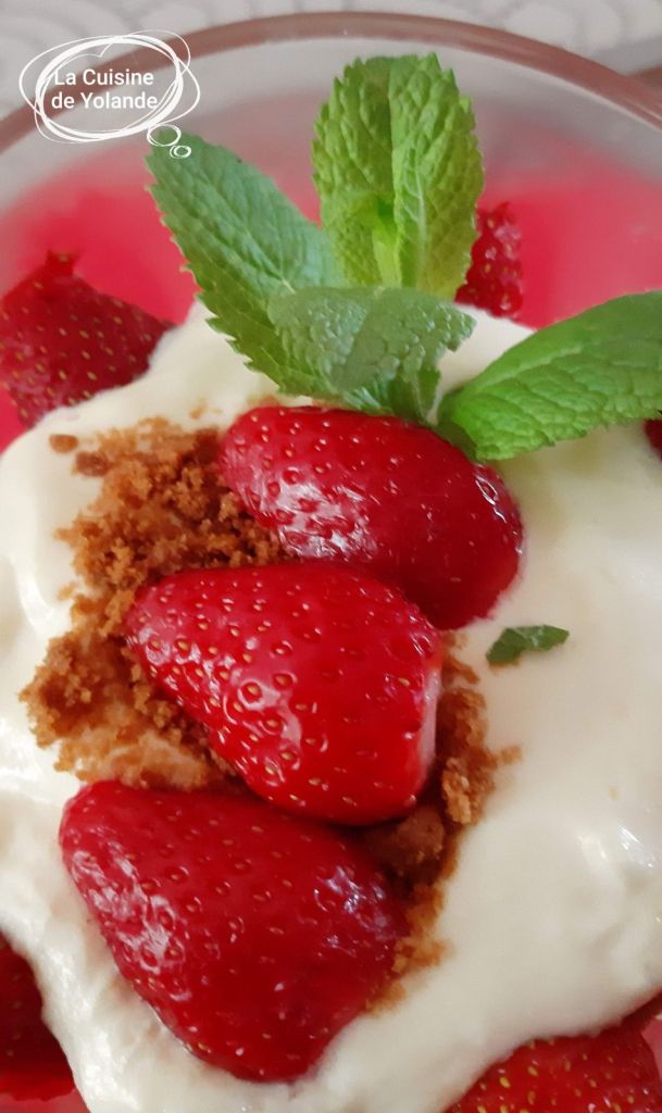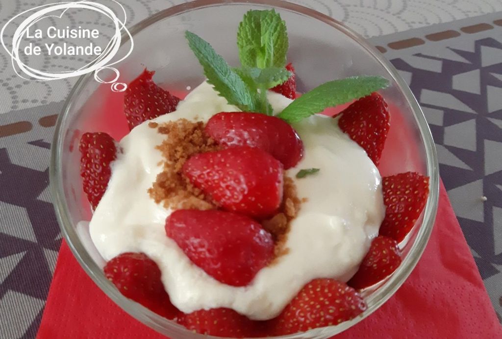 Dans des verrines en verre , disposez les fraises d’un coté, ajoutez la crème de mascarpone en une couche , ajoutez les fraises, et saupoudrez de poudre de spéculoos décorez de feuilles de menthes. servir très frais.