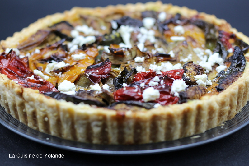 Foncez un moule à tarte de la pâte brisée, piquez-en le fond à l’aide d’une fourchette.Déposez les légumes grillés sur la pâte.