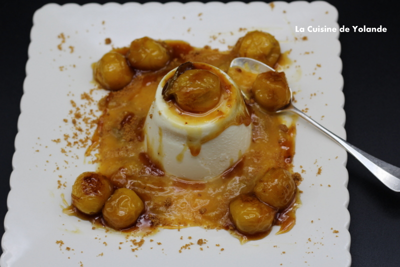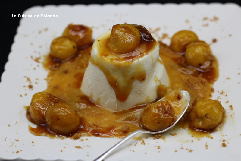 Dans une assiette à dessert , étaler la compotée de mirabelles au centre, démouler la Panna-cotta au dessus, puis décorer le tour de l’assiette avec les mirabelles au caramel salé . Saupoudrez de poudre de spéculoos.