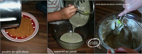 Réduisez les spéculoos en poudre assez fine , réservez. Fouettez les 3 jaunes d’oeufs avec le sucre jusqu’à blanchiment, ajoutez la farine et la levure tamisées , le lait puis le beurre fondu et les graines de pavot , mélangez afin d’obtenir une pâte lisse.