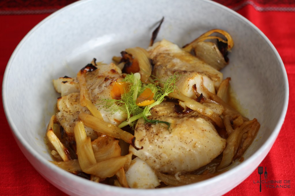 Une recette imaginée devant mon réfrigérateur, en faisant l’état de mon stock 3 dos de cabillaud bien frais, 2 bulbes de fenouil, et mon expérience du fenouil braisé à l’orange , qui me réussit toujours. Donc ni une ni deux , et zou me voilà partie pour l’élaboration de cette recette simple, et délicieuse, sucrée, salée .