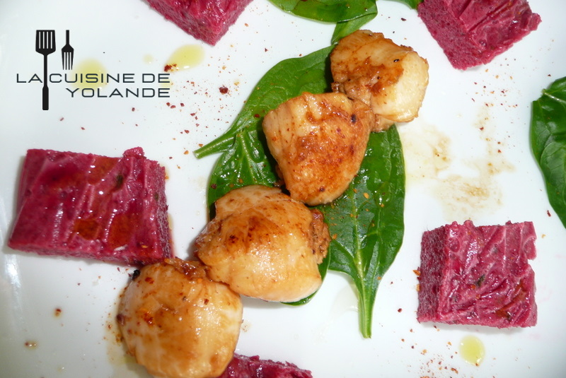 1. Ohlala Yolande comme ton assiette est bien tentante ! J’adore ça les noix de St Jacques et cuisinées ainsi, elles doivent être délicieuses. Tes cubes de gelée de betteraves c’est hyper original.