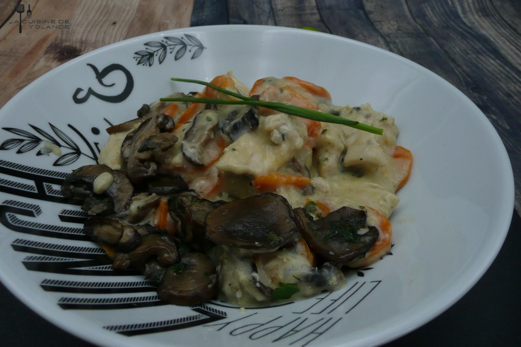 Quand les champignons sont cuits les ajouter au poulet incorporez le jaune d’œuf mélangé à la crème fraîche, mélangez bien , la sauce doit s’épaissir . Tenez au chaud avant de servir.