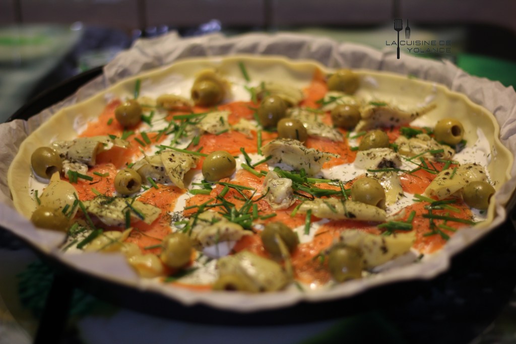 Placez votre pâton dans un moule perforée pizza , recouvrez le d’un papier cuisson, étalez-y la pâte et piquez -en le fond à l’aide d’une fourchette..Étalez a l’aide d’un pinceau 🖌 en silicone la crème fraîche, détaillez la truite fumée en fines lanières et déposez sur la crème, saupoudrez de ciboulette ciselée , disposez les olives vertes et arrosez légèrement de jus de 🍋.