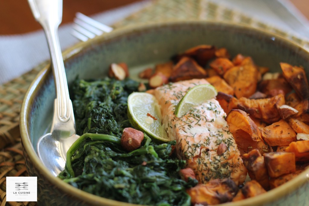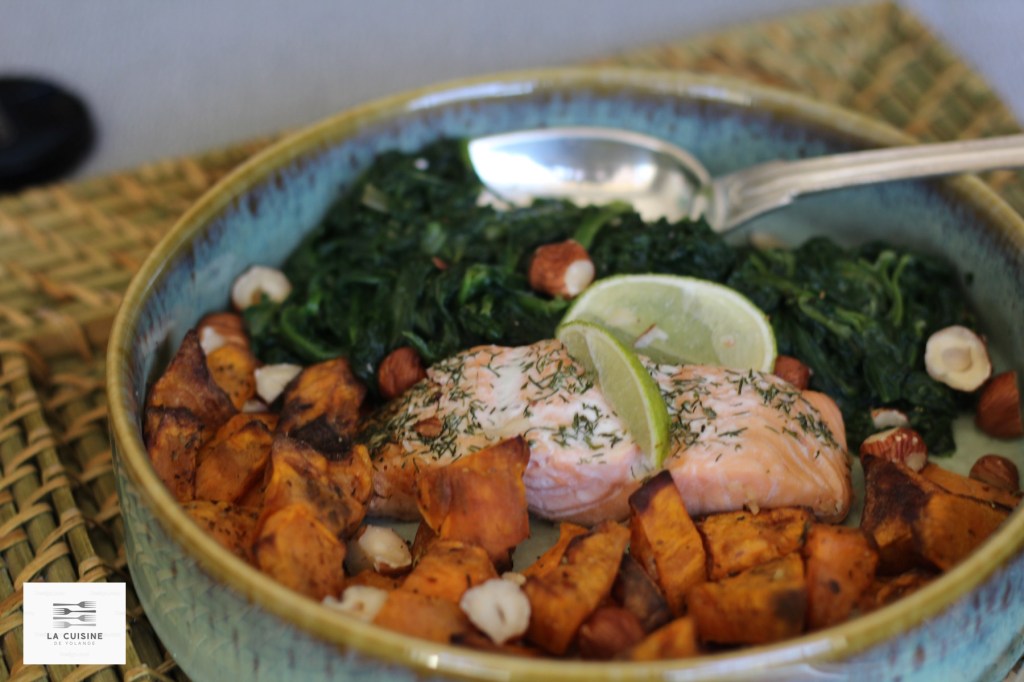 Bowl gourmand au saumon, épinards et patates douces croustillantes.