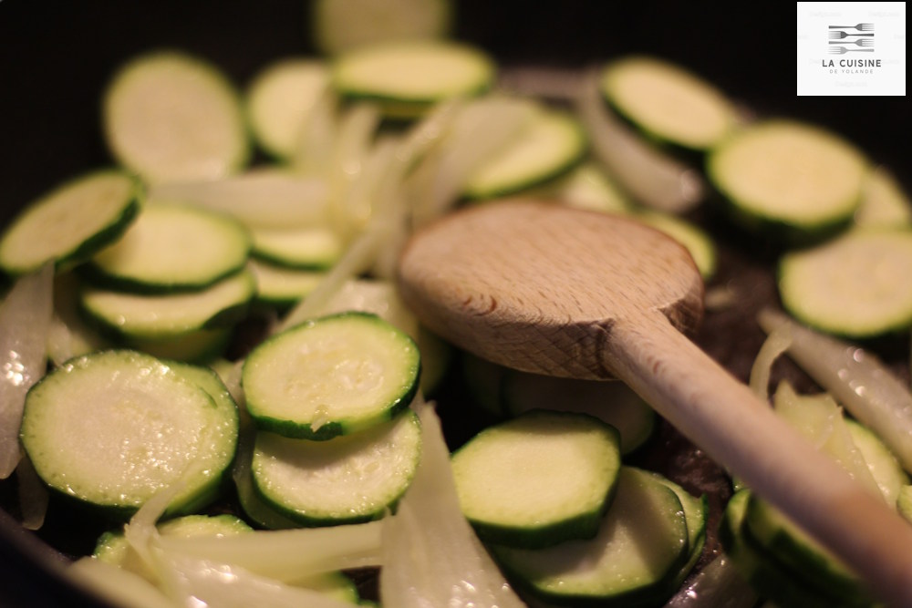 - Dans une poêle chaude graissée avec un filet d’huile d’olive, faire revenir l’oignon émincé. Ajouter les courgettes coupées en cubes. Cuire pendant 5 à 6 min.