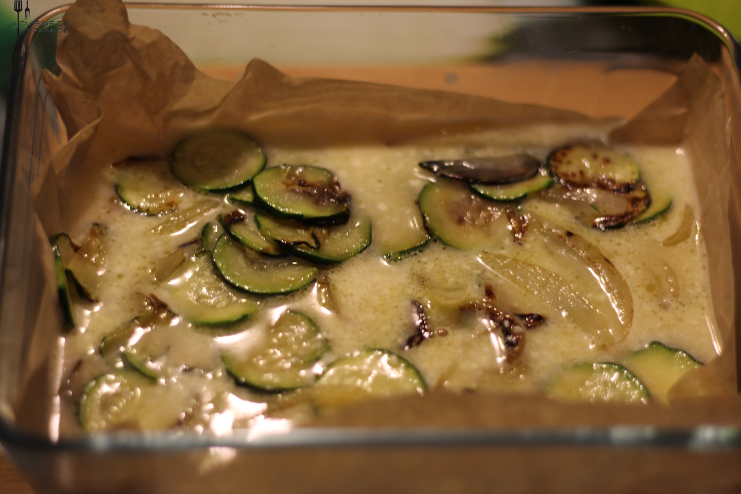- Verser le mélange œufs féta dans le plat, ajoutez les courgettes cuites. Faire cuire à 180°C pendant 15min.