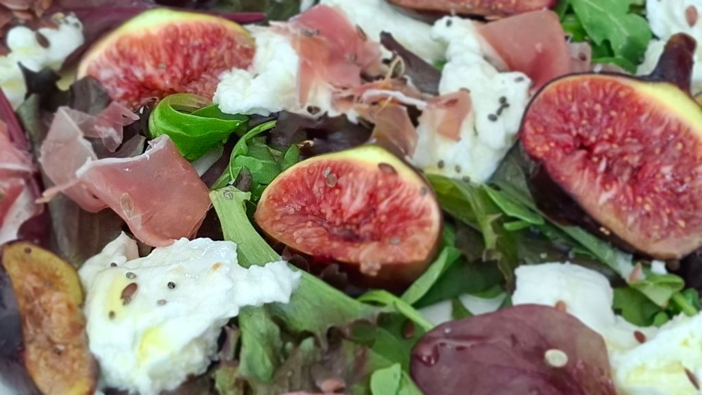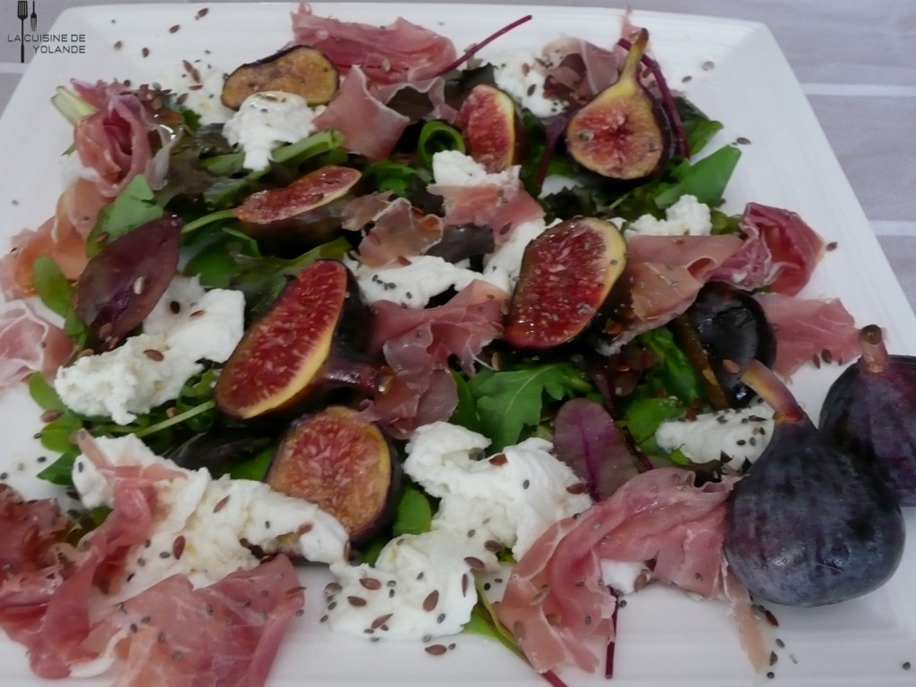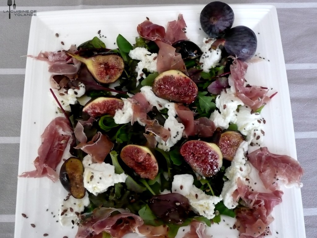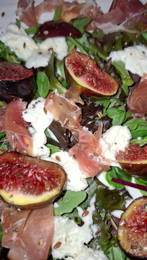 Salade tiède aux figues, mozzarella et jambon cru.