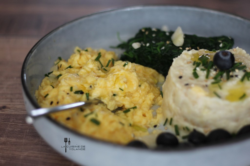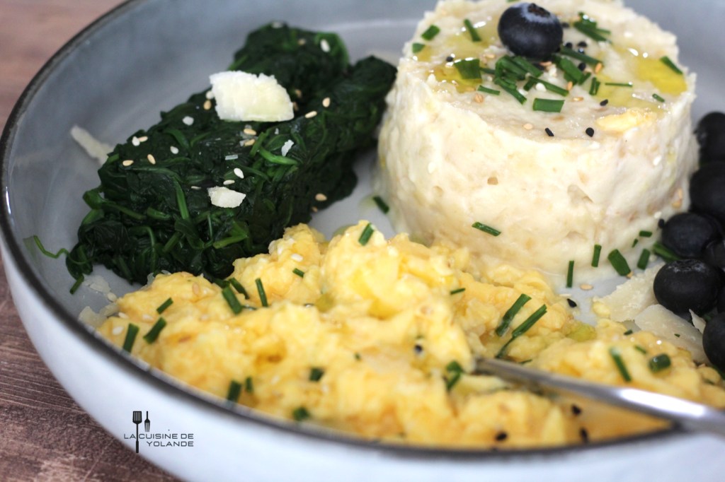 Mon petit grain de sel: Les œufs brouillés étaient délicieux et crémeux. Ils avaient ce bon goût du parmesan fraîchement râpé. Bien entendu, les épinards avec les œufs c’est au top. Ma purée de céleri apporte son énergie, pour faire de cette assiette un repas complet et équilibré.