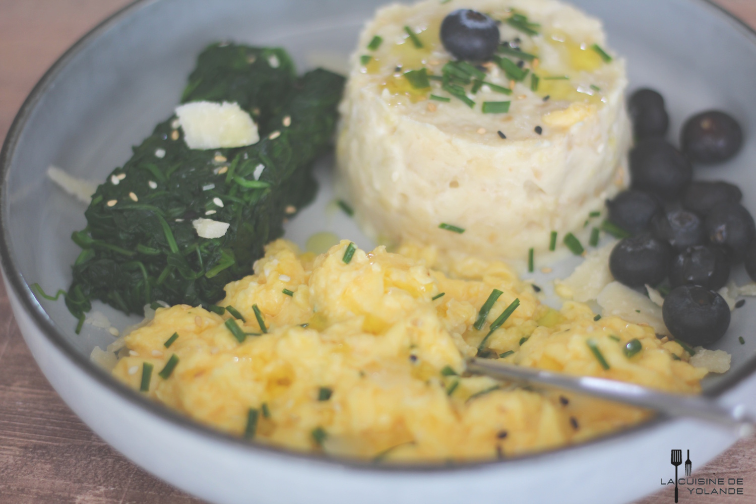 Mon petit grain de sel: Les œufs brouillés étaient délicieux et crémeux. Ils avaient ce bon goût du parmesan fraîchement râpé. Bien entendu, les épinards avec les œufs c’est au top. Ma purée de céleri apporte son énergie, pour faire de cette assiette un repas complet et équilibré.