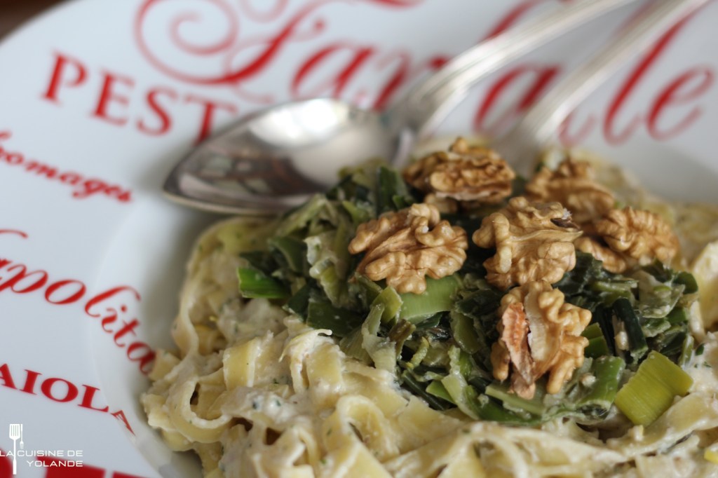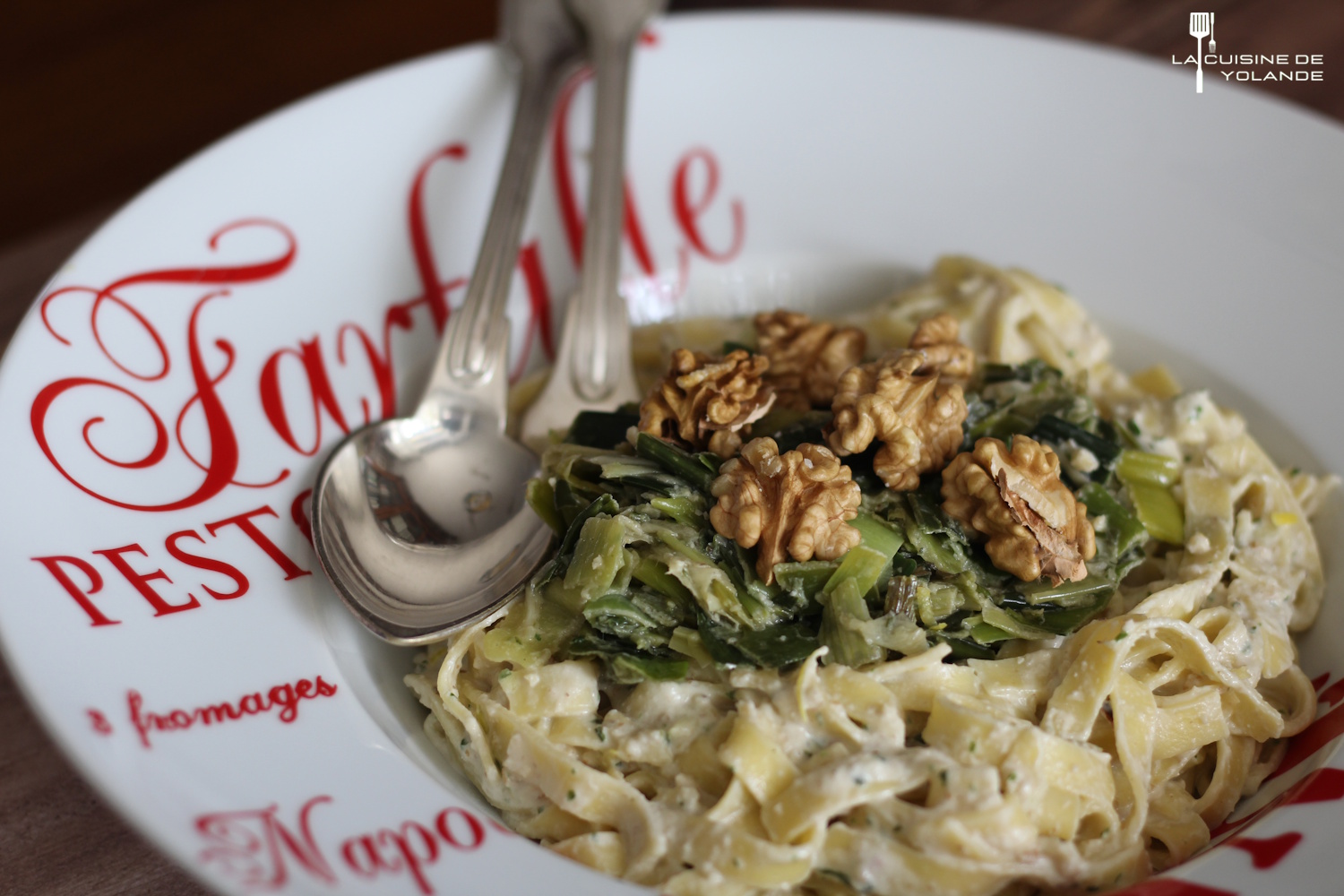- Egouttez les pâtes et mélangez à la sauce aux noix. Déposez dans un plat de service les pâtes avec la fondue de poireaux. Décorez avec les cerneaux de noix réservés. Servez aussitôt.