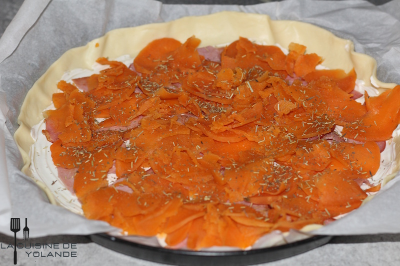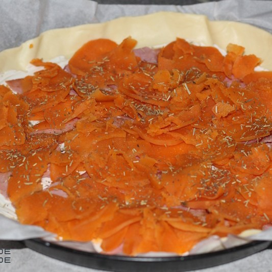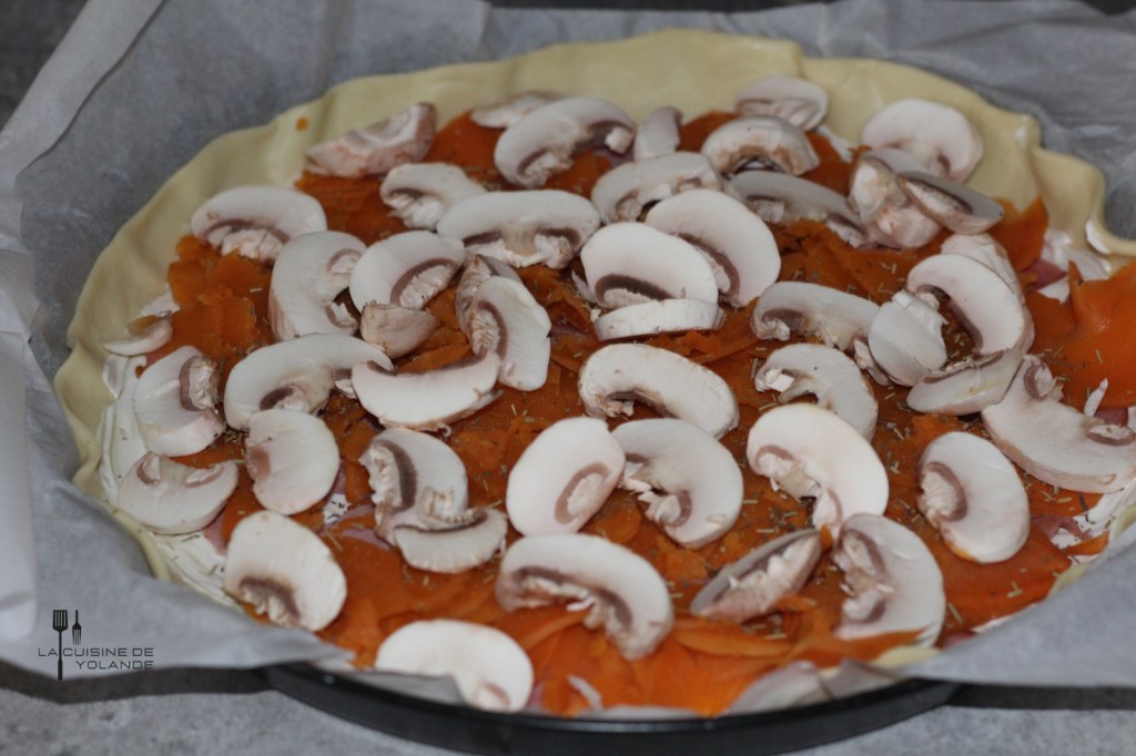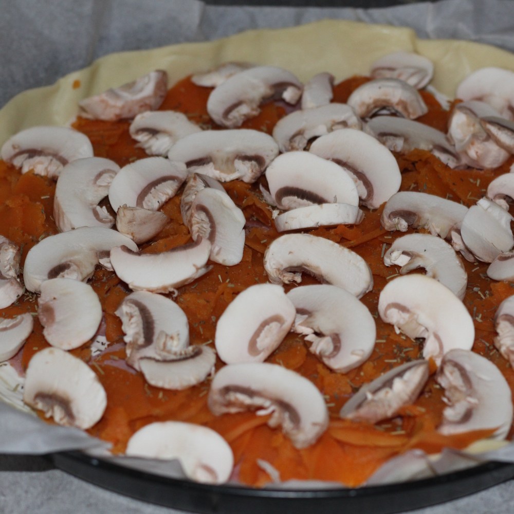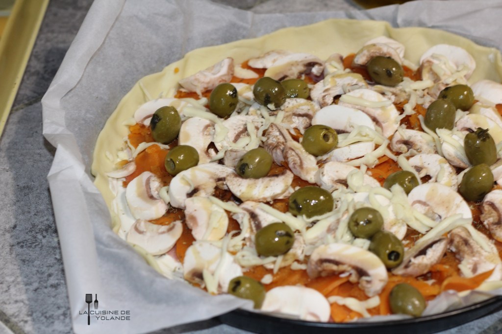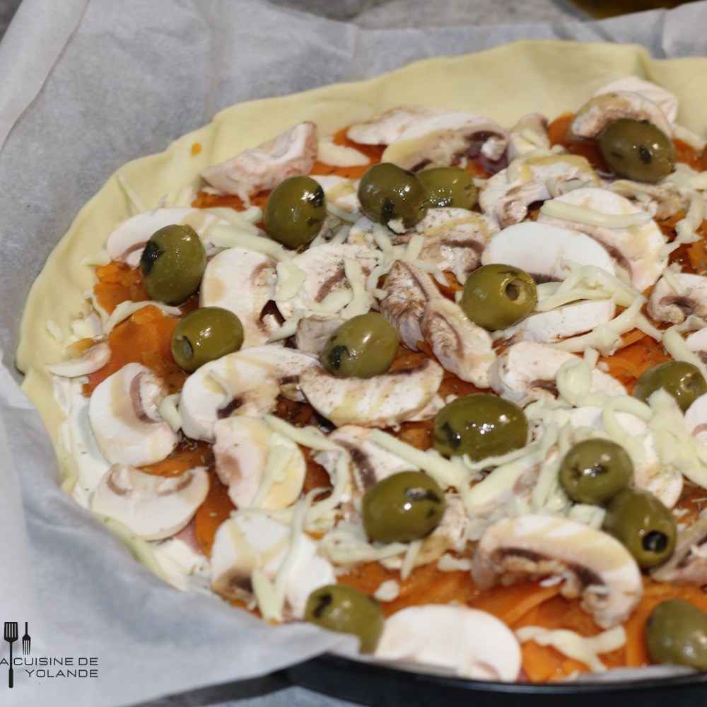 - Répartir l’échalote finement émincée, les rondelles de patate douce, le bacon coupé en chiffonade les champignons coupés en lamelles , puis la mozzarella râpée . Les olives sur le dessus .