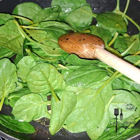 - Dans la même poêle non lavée ( on garde les sucs de cuisson des seiches ) on fait une tombée de pousses d’épinards environ 3min.