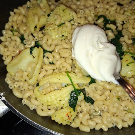 - Toujours dans la même poêle on verse les pâtes égouttées, les épinards, les seiches. On sale et on poivre .Remuez bien délicatement et ajoutez 1 c à s de crème fraîche épaisse allégée , continuez à remuer afin que tout soit bien imprégné de crème et du goût de la marinade.