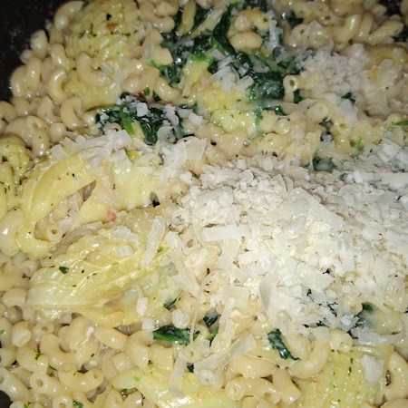 - Juste avant de servir , saupoudrez de parmesan râpé, remuez à nouveau car le parmesan râpé en fondant enrobe les aliments et donne à l’ensemble un crémeux délicieux.
