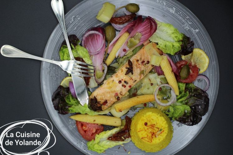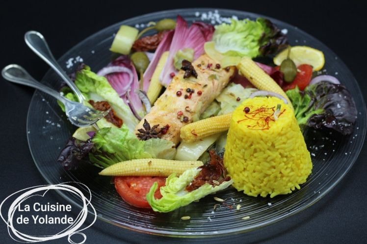 - Déposez les pavés de saumon cuits sur la salade, ajoutez les poireaux , les épis de maïs , les tomates séchées. Démoulez le riz sur l’assiette, saupoudrez quelques pistils de Safran du Quercy et versez le reste de marinade sur l’ensemble..
