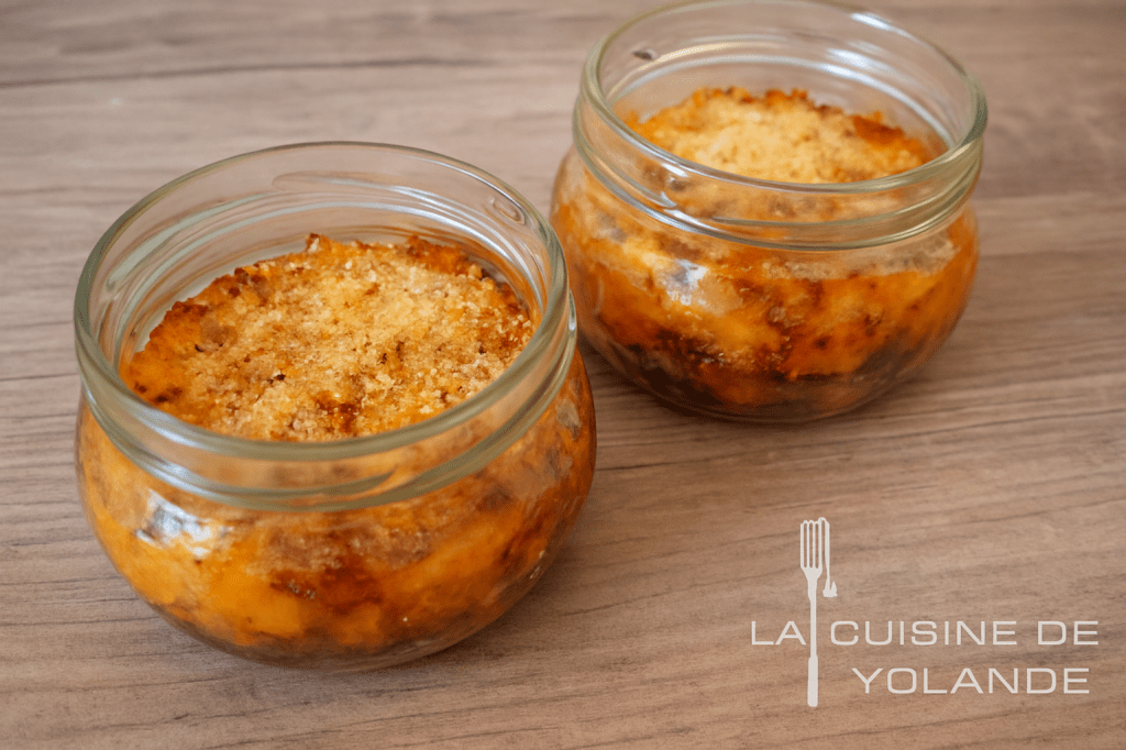 Répartissez- le tout dans un plat à gratin ( pour moi des bocaux en verre que j’aime beaucoup utiliser pour ce genre de plat et je sers en plats individuels.)