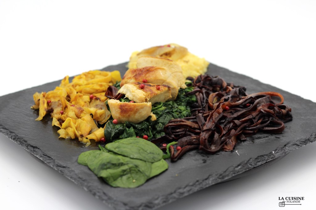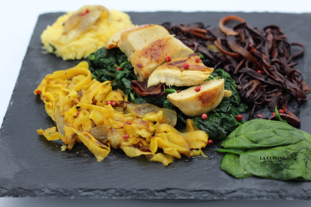 - 5 Dresser sur une assiette de service. Posez les épinards , puis le suprême de poulet coupé en médaillons. De chaque côté ajoutez les carottes jaunes et de l’autre coté les carottes violettes et déposez la polenta réchauffée avec des lamelles de l’oignon doré . Saupoudrez le tout de baies roses .