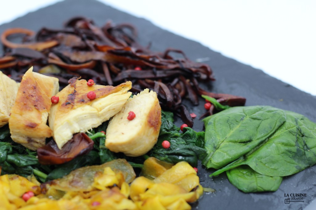 Il y a des assiettes qui naissent sans préméditation. On ouvre le réfrigérateur, on regarde les couleurs avant de même penser au goût. Deux carottes violettes, deux jaunes , quelques feuilles d’épinards frais et ce filet de poulet qui attend son heure. Alors on tranche, on poêle, on cisèle. L’oignon chante dans la poêle, les carottes deviennent tendres sans perdre leur caractère, les épinards s’abandonnent à la chaleur. Ce n’est pas un plat compliqué. C’est une assiette sincère, colorée. Une cuisine de saison, presque instinctivement, où chaque ingrédient trouve sa place et offre ses saveurs.