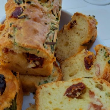 Clafoutis salé, olives vertes, tomates séchées et chorizo.